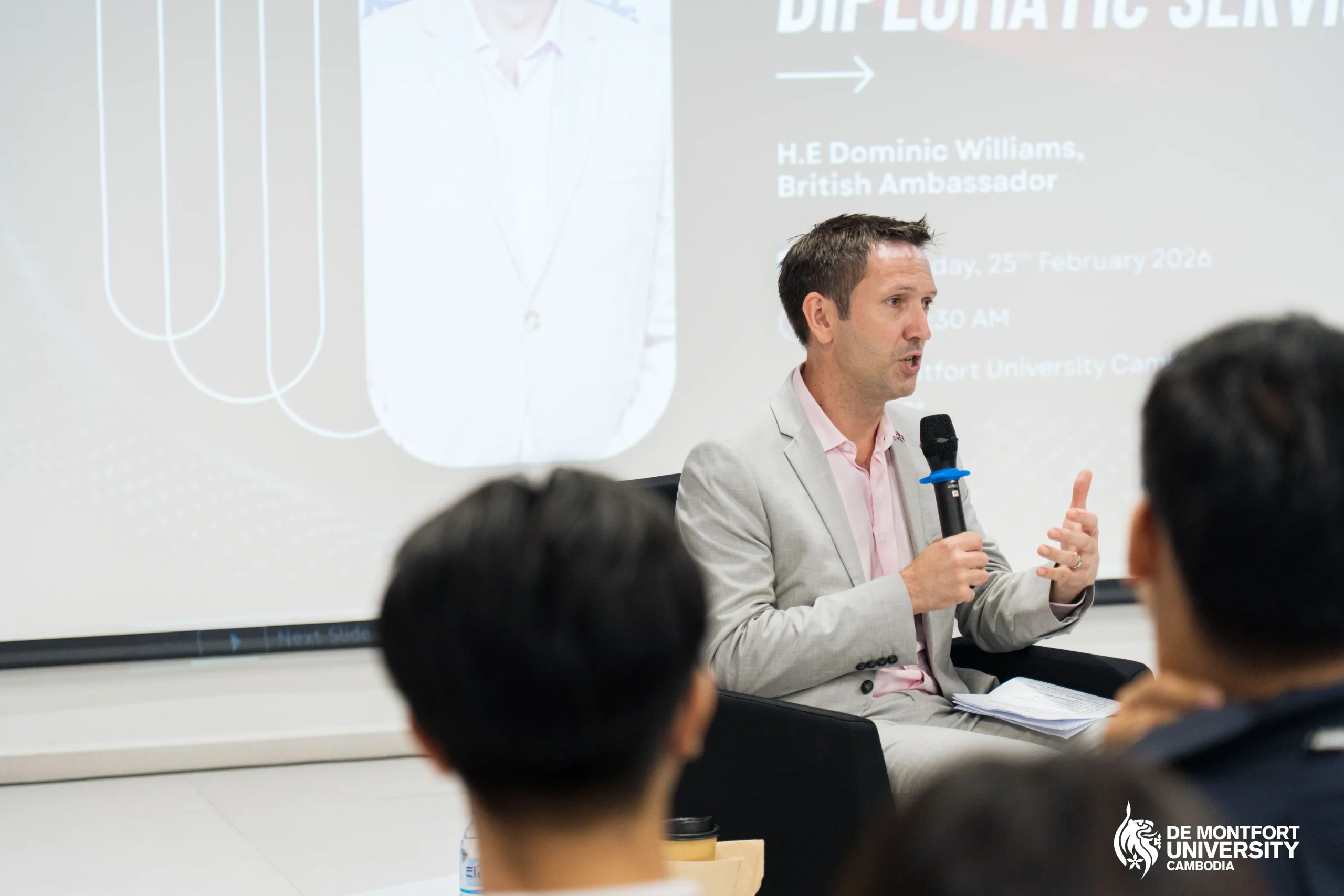 De Montfort University Cambodia (DMUC) was honoured to welcome H.E. Dominic Williams, British Ambassador to Cambodia, as a distinguished IFY guest speaker for a special session on International Relations and Diplomatic Services. Held on Wednesday, 25th February 2026, at the DMUC campus, the event brought together students eager to gain real-world insights into diplomacy, global affairs, and international cooperation.